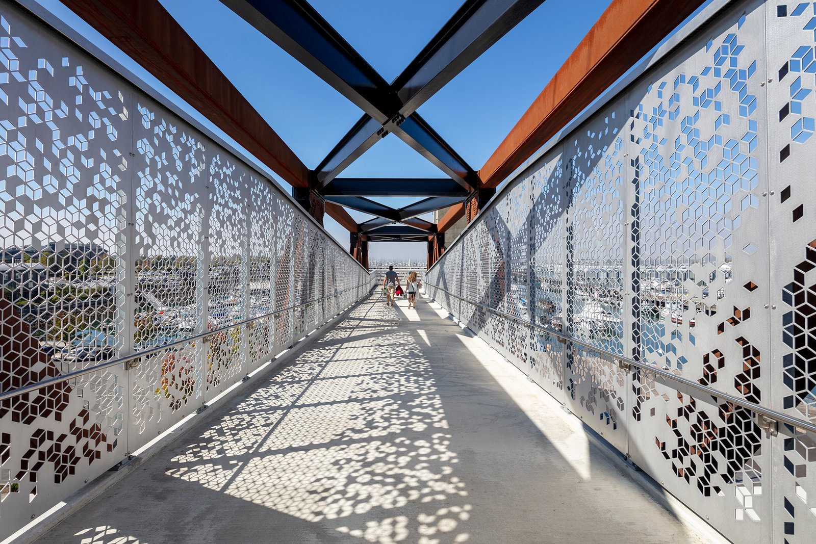 The weathering steel structure is contrasted with 400 aluminum panels which were perforated with a CNC Waterjet using a computer script that automated the layout, numbering and cut file production. This ensured that each aluminum panel is unique and responsive to the geometry of the bridge as well as fulfills varying guardrail requirements. The varied density of perforations was engineered to enhance reflectivity of the lights while minimizing glare and light pollution. In a press statement, LMN Partner Stephen Van Dyck, AIA said that Grand Avenue Park Bridge is a destination. The bridge’s paths, stairs and spaces create a variety of views beyond and within that make it a place of discovery.