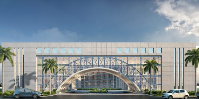 The MS arch has been designed as the main support structure – 1 floor deep and cross-braced for rigidity and stability, over which the secondary MS structure rests. The arch thus transfers the load from floors above, over, and around to its foundation thereby allowing the creation of the 45m wide and 12m high voids allowing selective view of the intriguing courtyard and features inside.