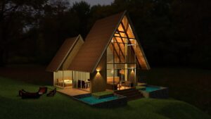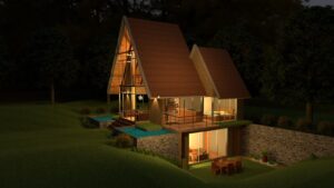 Steel was chosen so that blasting of rocks to lay a deep foundation could be negated and instead be easily installed on the natural slopes and create a lightweight structure that fell within the guidelines of the government bylaws. The sloping roof is an iconic element and will protect the house from rain instead of a concrete flat roof. This also gave way to a free, large, and unobstructed internal plan. Steel made it possible to build a visually light structure that not only enhanced the spatial effect but also cut down the cost which gave the luxury to install water bodies in the garden which will be fed through rainwater harvesting.
