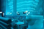 every furniture has been customized and designed for the project, offering different seating options to create different experiences for the visitors from low lounge seating and shared tables to high stools and semi-private couple seating. A grey and white color palette has been chosen with metallic finishes for the tables and fabrics to generate reflections that create the distortion that could be made by water.