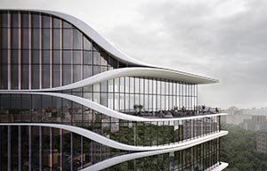 The building is 64 meters high, resulting not just in a local but a global experience of visibility of the vertical fins that light up as prayer flags throughout the city. A generous cantilever has been embedded in the design where the ground floor peels back to create a generous welcoming drop-off area for the visitors.