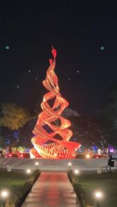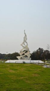 The entire sculpture has been articulated as a flame rising from Mother Earth and reaching for the skies. Fire (Agni) symbolizes many things in the Indian culture like purity, spirituality, knowledge and enlightenment, all leading to the path of truth. It is this flame that resides within the depth of our subconscious mind and subsequently brings inanimate life to be. Agni is symbolic of intention. It also represents the higher faculties of the subconscious mind (superego), the part that wants us to thrive and informs the ego about what we need to do to evolve. This concept of the eternal flame is timeless and can easily transcend different generations.