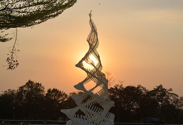 The entire sculpture has been articulated as a flame rising from Mother Earth and reaching for the skies. Fire (Agni) symbolizes many things in the Indian culture like purity, spirituality, knowledge and enlightenment, all leading to the path of truth. It is this flame that resides within the depth of our subconscious mind and subsequently brings inanimate life to be. Agni is symbolic of intention. It also represents the higher faculties of the subconscious mind (superego), the part that wants us to thrive and informs the ego about what we need to do to evolve. This concept of the eternal flame is timeless and can easily transcend different generations.