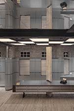 Inscribed with the logo of MASONPRINCE, the metal glitters with a futuristic sense found in science fiction, covering the old walls that belong to the present. A weird humanoid figure from the future sits behind a modern office desk. The well-selected items of MASONPRINCE are displayed here, arranged in rows stretching deep into the space under the dim, yellow light. Videos about MASONPRINCE are played on a screen, which is like a time mailbox that delivers fashion packages to time travelers who visit the store. The interplay between the future and the present within the space and the contrasts it creates bring a unique experience to the visitors. As the interrupted timeline extends deeper into the space, vagueness and contrast develop in the spatial functions and the expression of substances.