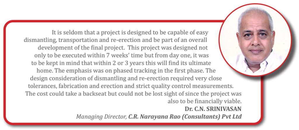 There were some specific design requirements for this temporary facility. The buildable area needed to be maximized within a certain height restriction, in a narrow long site with restricted access. The pre-existing superstructure was to be completely dismantled, transported and reassembled at the new site so as to make it an integral part of the major facility that was going to be created. The new facility structure also needed to be capable of carrying heavy service loads and since the facility would be servicing MNCs, a high-class finish was expected. Apart from these, the facility needed to be cost-effective since it was short-term and had to have ease and speed of construction, dismantling and re-erection. All these works needed to be completed within 84 days in a tightly spaced site with access limitations.