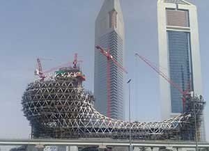 The length of the structure is 132 meters with a height of 61 meters and a width of 39 meters. 2210 diagrid members have been used to build the skeleton of the structure along with 717 diagrid assemblies and equipped with three staircases and two bridges. The weight of the main steel sums up to a whopping 4913 tons.