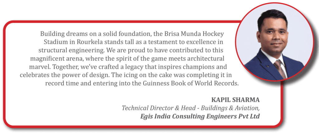 Constructing the Birsa Munda Hockey Stadium amid the challenges of the COVID-19 pandemic and adverse weather conditions was a significant hurdle. The disruption of global manufacturing and supply chains due to the pandemic and the Russia-Ukraine conflict further complicated the project’s delivery timeline. Procurement and fabrication of structural steel and façade materials faced delays, necessitating increased manpower and working hours to catch up.