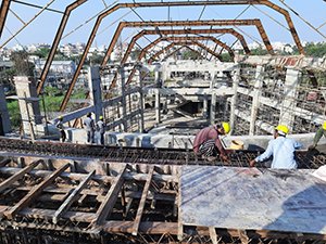 The front part of the roof is designed in structural steel as a long cantilever and is primed using a heavy structural steel box section on which the other two portal frames rest. These portal frames are designed to take a combination of Dead load, Live Load and Wind loads and transfer the same to beams and bracings and hence to base plate to RC foundations.