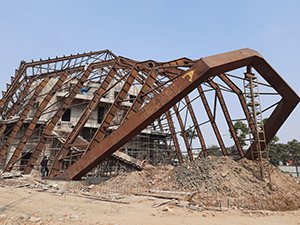 The exterior is adorned with 20 steel portal frames (1 inclined) covering 84 meters in length and varying heights of maximum 21 meters and a minimum of 8.3 meters. These portal frames are attuned with varying web depth and flange width as per the design requirement.