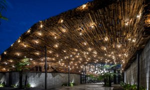The parking area has a roof system large enough to shade the car from the sun and rain while ensuring aesthetics and attractiveness to diners, the roof system is composed of three layers including one layer of rainproof poly that still lets light through, one layer of main bearing structure, one layer of decorative wooden ceiling create an attraction for the first point of the building.