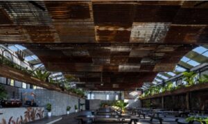 Indoor dining area: the insulated corrugated iron roof combines the old decorative ceiling system, the misting system cleverly hides on the roof and the array of trees is hung up to reduce heat and increase the feeling of freshness for the restaurant. Diners create a distinct attraction for this area.
