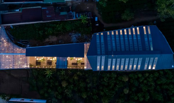 Half-indoor – half-outdoor dining area, with half of the roof system structured such that one can pull it out and look at the sky above when needed, the trees are jostled together like a semi-open curtain to create space. Not too discreet for diners and at the same time enjoy a close-to-nature dining experience.