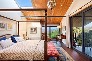 The villa is split into three levels to offer differentiated experiences and uninterrupted lines of sight. Residents enter via a wooden boardwalk into the living quarters which also comprise a kitchen and dining area. A north-facing deck and a south-facing court promote outdoor lounging with panoramic vistas of the forests beyond. The floor above hosts bedrooms featuring floor-to-ceiling bay windows and skylights that frame expansive views of the landscape and fill interior spaces with daylight. The lowermost level houses the guest bedroom, staff quarters and ancillary facilities, merging with the gradient of the slope under canopy of native vegetation. The dining area doubles up as a conservatory, which, in addition to the sliding doors, window walls, and skylights, illuminates the interiors with daylight and enables residents to stargaze at night. The sun-drenched south court is strategically located to establish a seamless inside-outside experience and maximise views of the natural setting. The material palette of timber, slate, and local stone builds on the lexicon of koti-banal architecture, endemic to the Kumaon region. The interior design scheme further underpins the experience of being cocooned in a treehouse through its use of hand-crafted woodwork that blends classic notions of a simple wood structure with modernist angles, clean lines, and contemporary design elements.