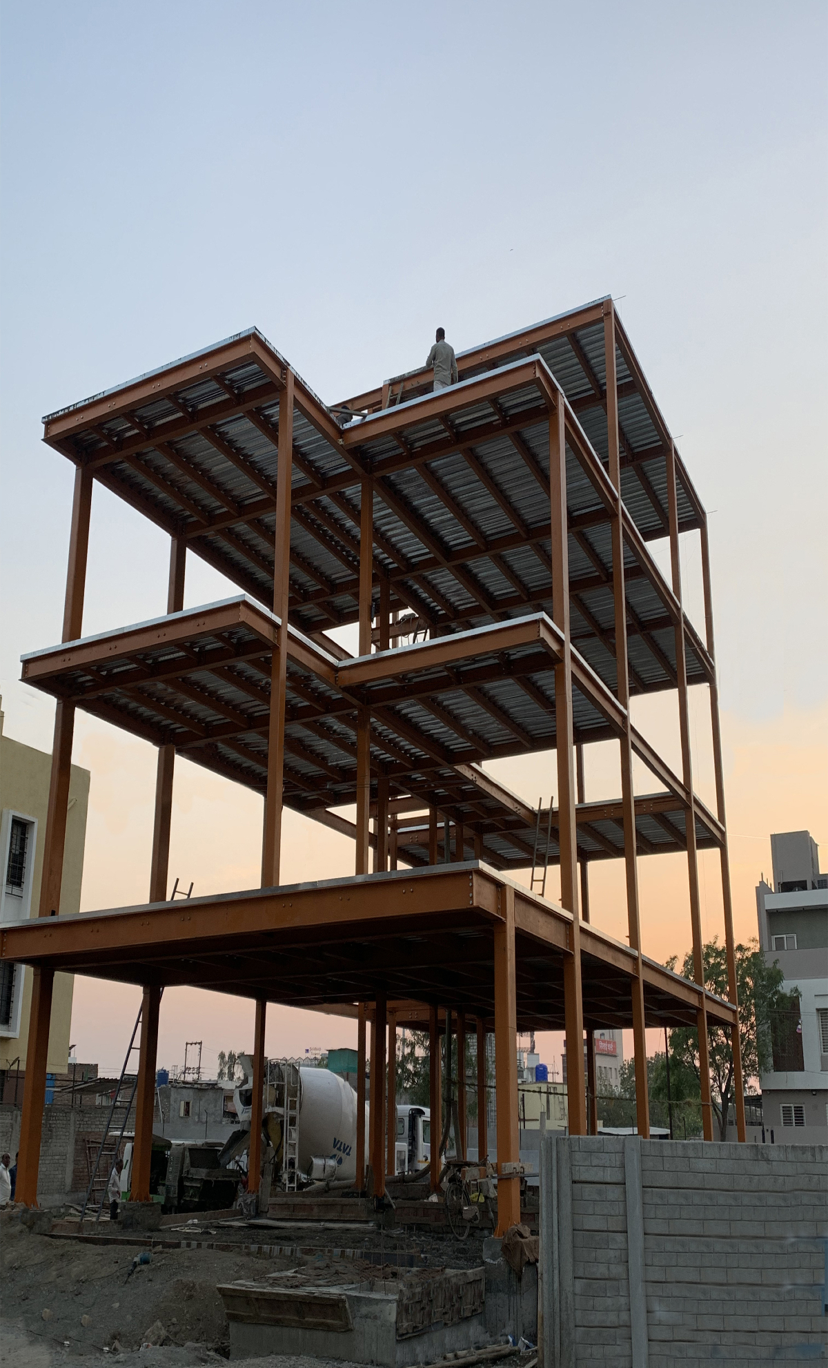 According to the design, the beams and columns were fabricated at the fabrication unit and then erected on-site within two to three days using a crane and nut bolts. GI decking sheets were used for all four floor slabs, with steel reinforcement placed on top, and a concrete slab was cast using RMC in one day, completing the entire structure in just fifteen days. This technique not only expedited construction but also ensured the buildings could withstand earthquakes.