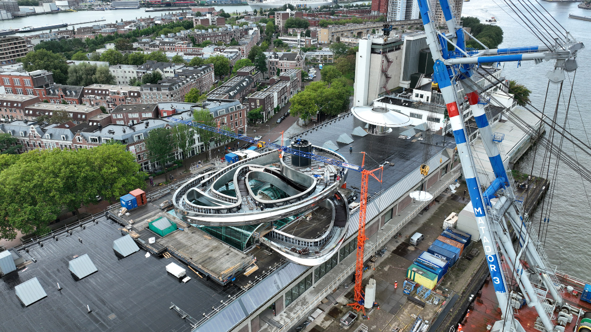 Complementing the Tornado is an existing 550 m long, double-helix wooden staircase within the museum. Together, these staircases guide visitors through the building, connecting the past with the future and leading to a panoramic viewpoint that offers breathtaking views of Rotterdam’s harbour and cityscape.
