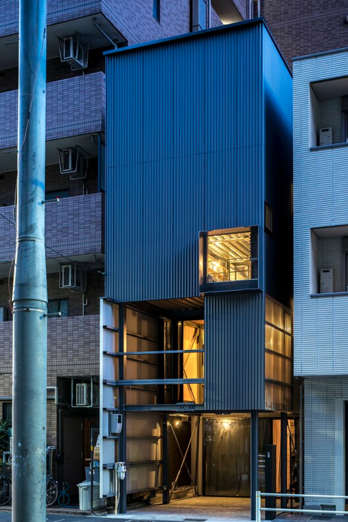 The House ‘irfn’ is designed for a married couple with two children and is situated on a small plot in a densely populated urban area. It features a steel structure with 125 x 125 mm H-beam columns and beams. The architectural grid includes five spans of 2.4 x 3 m and four stacked spans of 2.4 x 2.4 m, creating a layered composition linked by a full-height stairwell extending from the central grid to the rooftop.