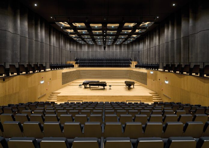 The concert hall is constructed with reinforced concrete, chosen for its inherent mass and acoustic performance. Internally, the auditorium walls are shaped using wavy formwork, with the raw concrete left exposed and treated with a black glaze finish. This surface treatment not only enhances the visual depth of the material but also negates the need for supplementary acoustic cladding, ensuring both material efficiency and acoustic integrity.
