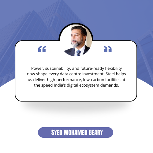 In the past, material selection was simply a structural question. Today, it is a strategic one. When hyperscale facilities require rapid deployment across multiple regions, steel becomes a catalyst. “Steel cuts construction time dramatically,” says Syed Mohamed Beary, whose developments reflect some of the fastest delivery timelines in India’s data-centre landscape. “It is lighter, stronger, more adaptable, and far more sustainable in terms of embodied carbon and recyclability.”