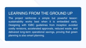 A defining strength of the project lies in how early sustainability entered the decision-making process. Architectural, structural, and MEP planning were guided by IGBC-aligned benchmarks from day one, ensuring that energy efficiency, water conservation, and environmental compliance were not isolated objectives but interlinked outcomes.