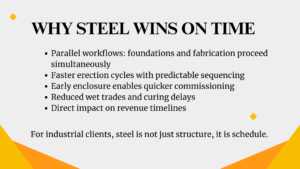 From a sustainability standpoint, this adaptability is powerful. It aligns perfectly with the principles of circular construction. Steel’s recyclability and reuse potential make it inherently suited to long-life, evolving industrial facilities.