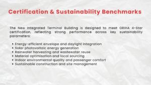 The Vijayawada Airport terminal is targeting GRIHA 4-Star certification, reflecting strong performance across energy efficiency, water conservation, material optimisation, and indoor environmental quality.