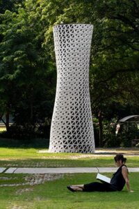 The name Verto is derived from the word “turn”. The tower rotates as it rises and transforms the environment by turning polluted air into clean air. The triangular perforations are designed as a performance-driven system, with bigger openings at inlets and outlets. The air is sucked in from energy-efficient fans and then gets filtered using fine dust filters to remove the pollutants from the ambient air. An IOT control system enables the operation according to the demand.